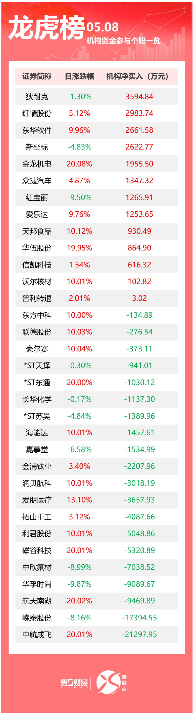当天机构净买入前三的股票分别是狄耐克、红墙股份、东华软件,净买入金额分别是3595万元、2984万元、2662万元。