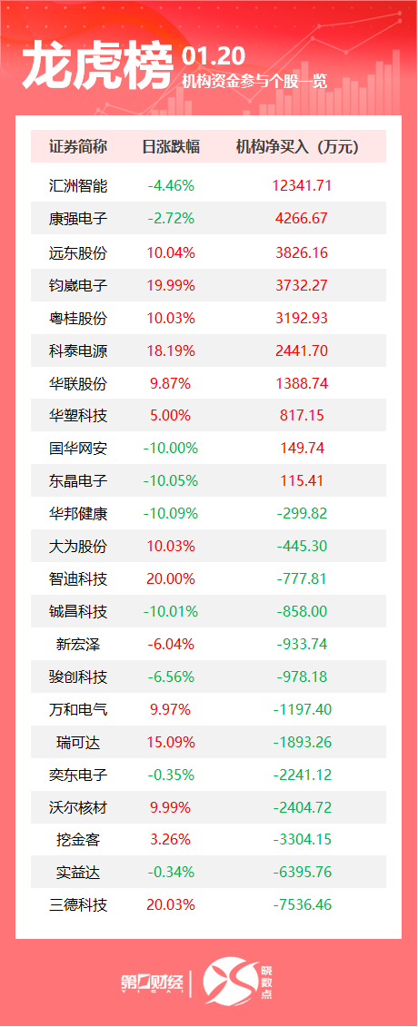 165 03-31 18:23龙虎榜丨机构今日抛售这13股,买入汇洲智能1.23亿元