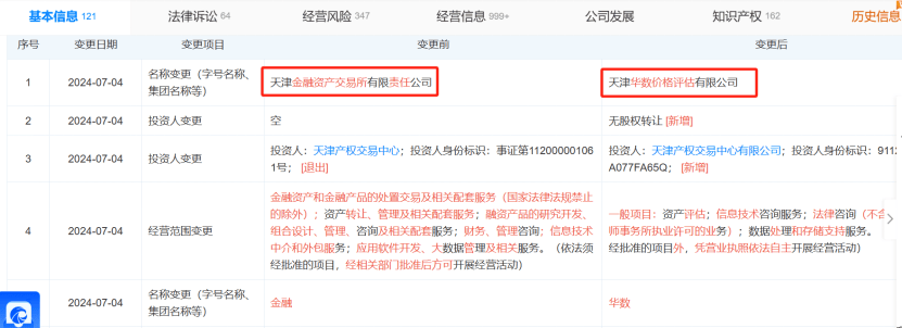 7月4日,天津金融资产交易所变更为天津华数价格评估有限公司。